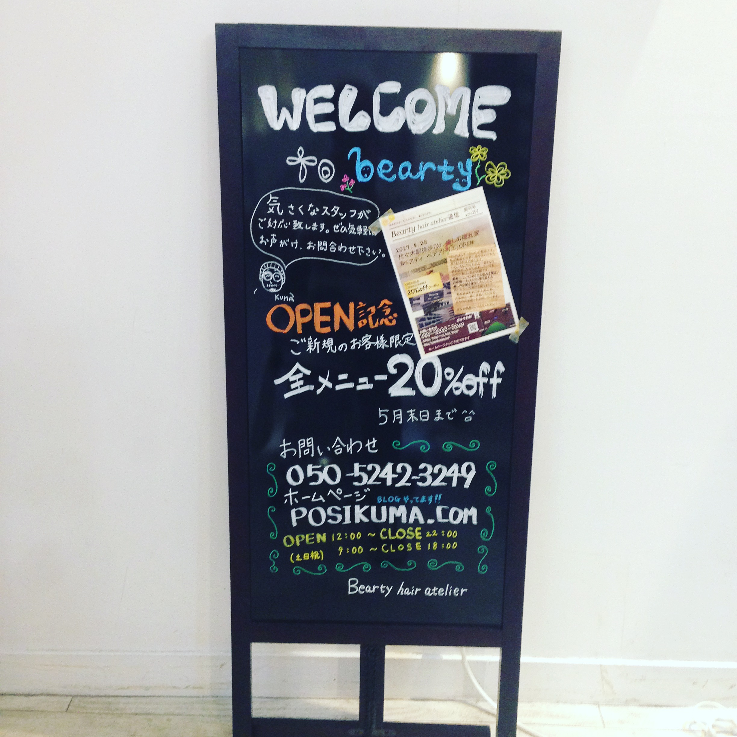 OPEN記念!ご新規のお客様全メニュー20%OFF、5月末日までとなっております!