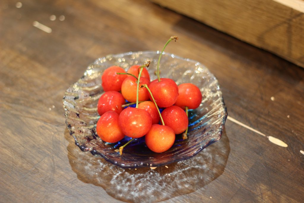 佐藤錦という品種で糖度が高く冷やしてから食べるとより美味しいです。 大きくなりすぎると皮が割れてしまうので、ギリギリのところで収穫されたさくらんぼは皮が張っています。 琉球ガラスに盛り付けるとより夏を感じますね。 大体は …